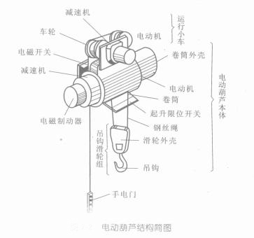 (2)提升機構又是葫蘆本體,由四個裝置組成:傳動裝置——減速器,驅動裝置——電動機,制動裝置——制動器,取物裝置——吊鉤滑輪組、卷筒、鋼絲繩等。